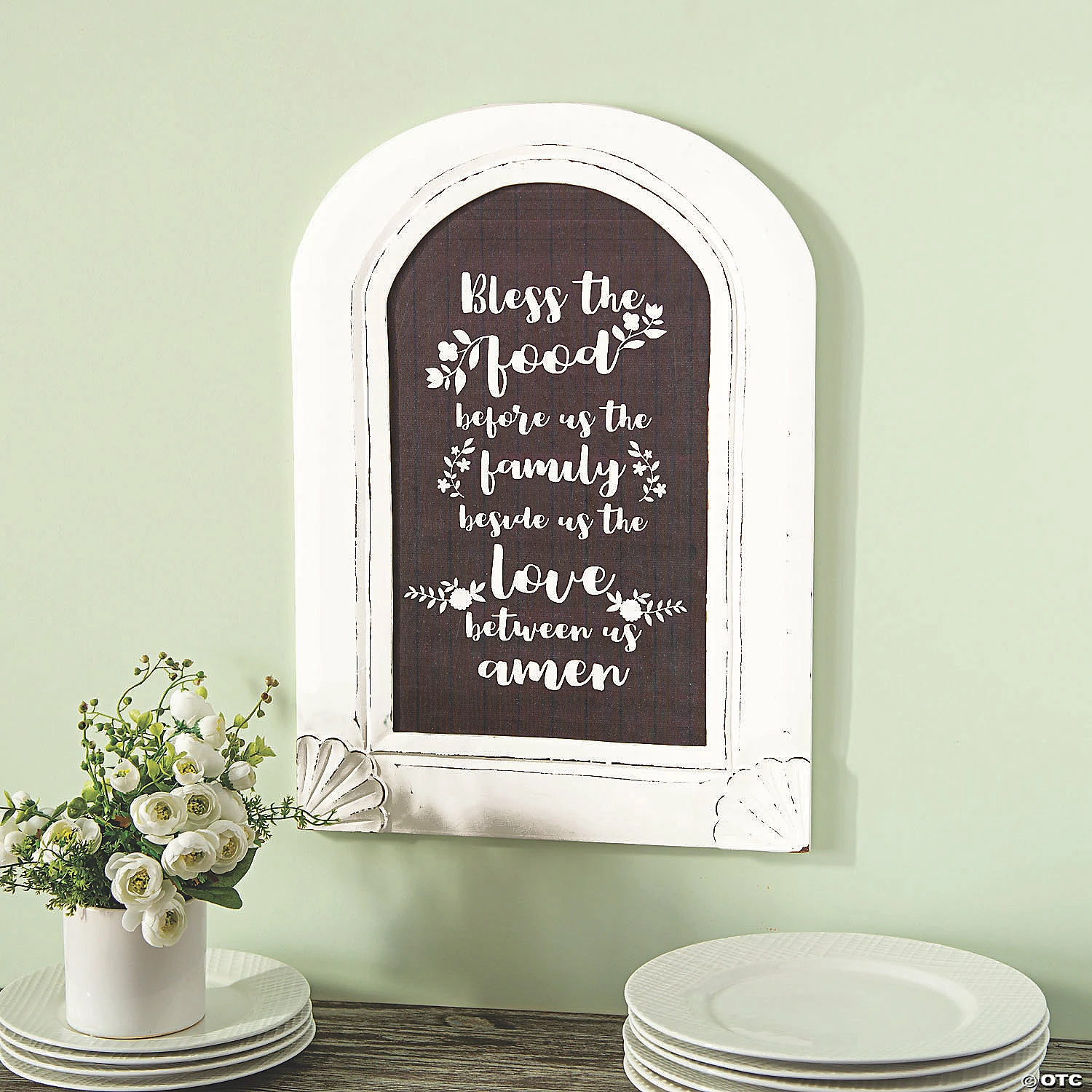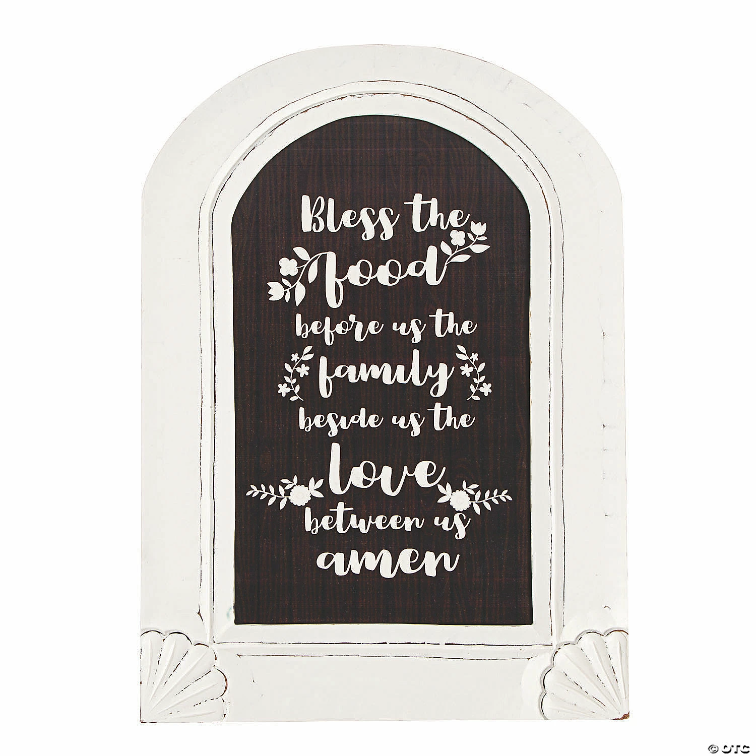 This sign, which reads βBless the food before us, the family beside us, the love between us. Amen,β can hang in a dining room or kitchen as a home dΓ©cor reminder to be thankful and count our blessings each day. In a weathered, white-washed frame that is shaped like a church window, this simply adorned piece of wall art is a spiritual gift that will inspire everyone in the home. Includes hardware for hanging. Wood. 15″ x 21″