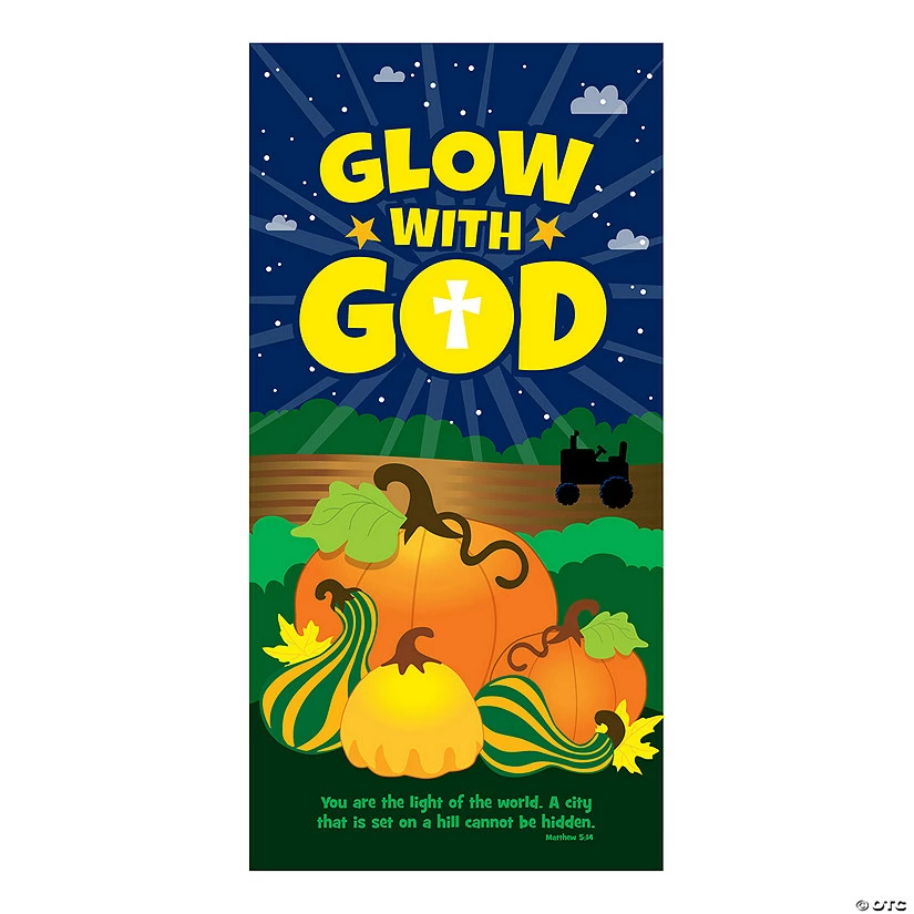 To God be the Glow-ry in all seasons! This colorful door banner has a vibrant fall look and features the message βGlow with Godβ and Scripture from the Book of Matthew. A great choice as a Sunday School door decoration for Halloween or to display at home for trick-or-treaters to see, this door banner helps keep the focus on God instead of ghouls. Plastic. 3 ft. x 6 ft. Β© OTC
