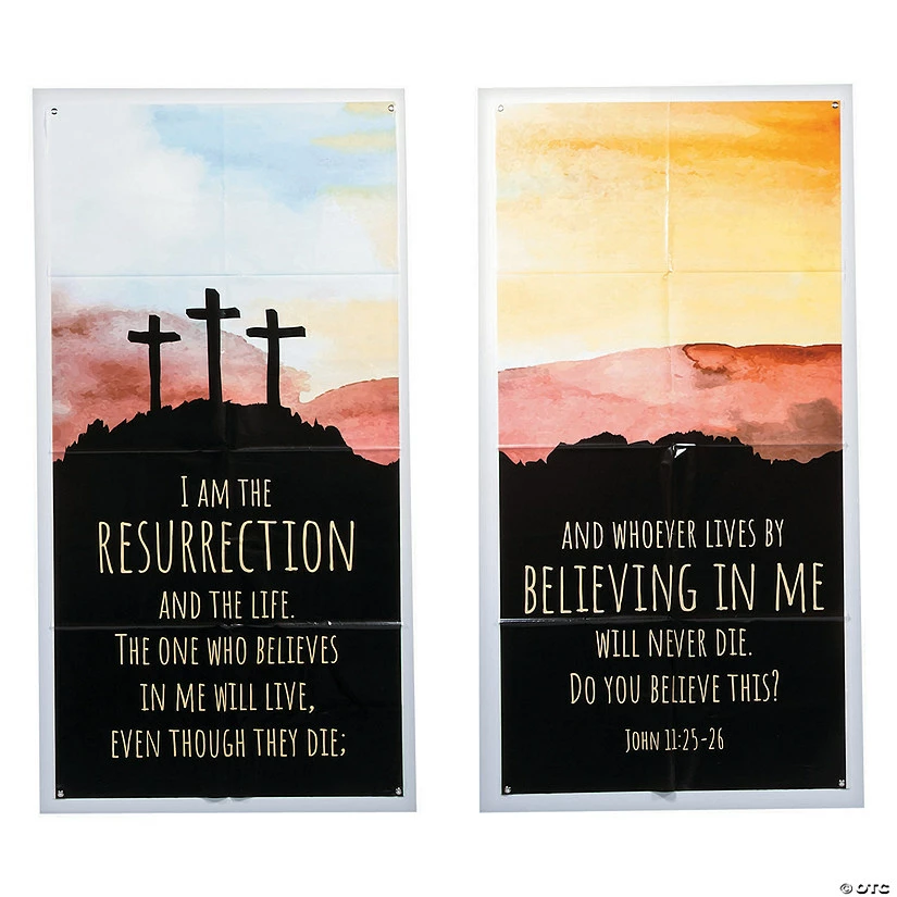 Decorate your church for the Easter season with this beautiful and impactful resurrection banner set. These banners are perfect for just inside a church entryway or elsewhere in a place of prominence, and they can be used year after year. A great addition to church Easter decorations. Vinyl. (2 pcs. per set) 3 ft. x 6 ft. Includes grommets for hanging. © OTC