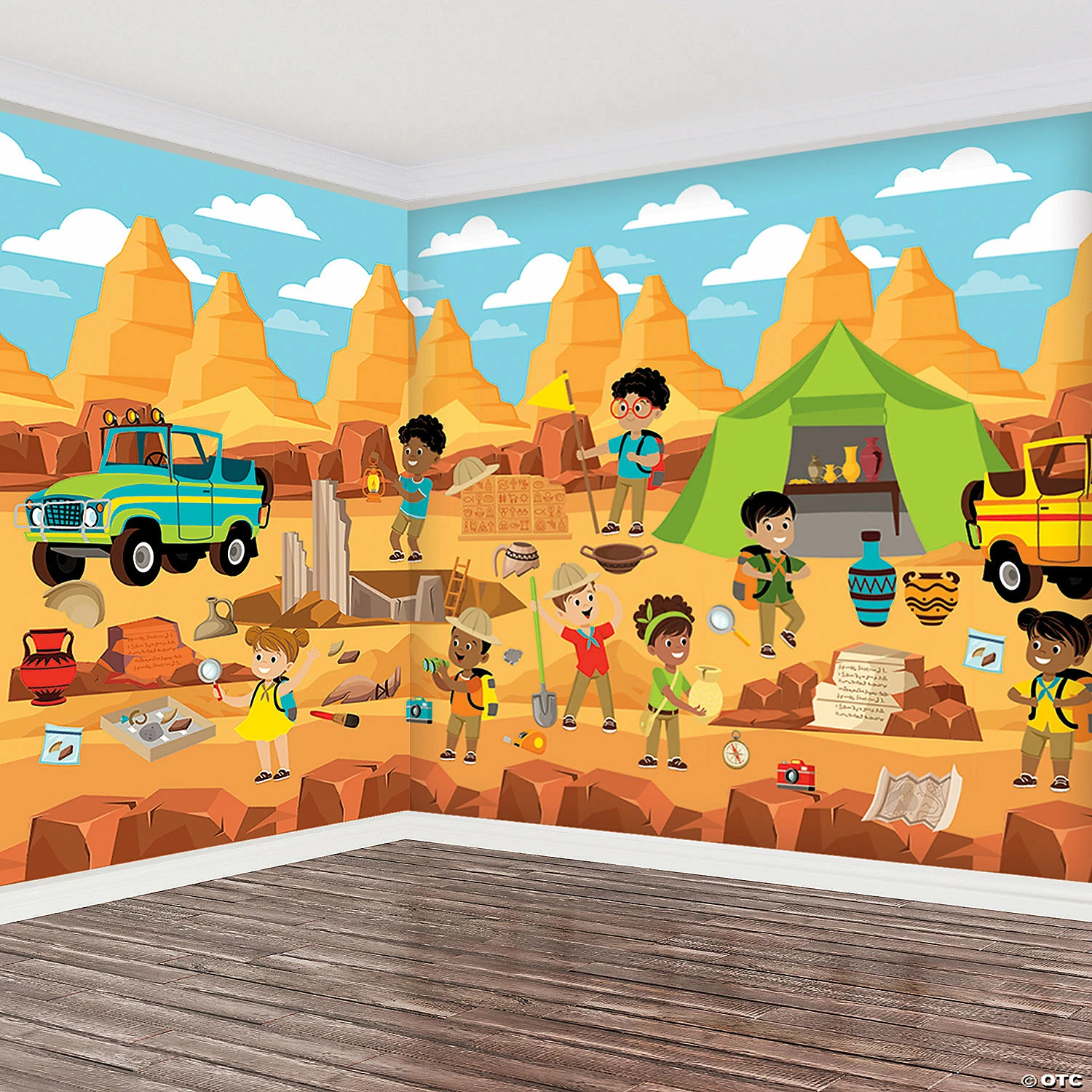 Do you want your kids to get a desert dig experience, but itβs just not practical to take a bus to an actual archaeological site? Bring the dig to the kids with this helpful Design-a-Room pack, featuring impressive backgrounds that help transform any any space into an archaeological dig in the desert! (6 pcs. per unit) Simple assembly required. Assortment may vary. Β© OTCIncludes:β’Β 1 Plastic Dig Design-A-Room Background (2 pcs. per set. Assembled, 30 ft. x 8 ft. Simple assembly required. Use your own wall adhesive for hanging.)β’ 1 Plastic Dig Design-a-Room Decoration Set (4 sheets per set. 3 ft. x 6 ft. Individual decorations must be cut out with your own scissors.)