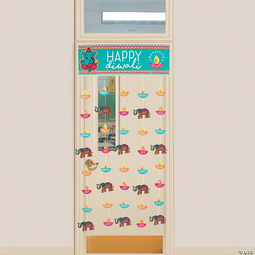 Welcome guests to your Diwali celebration with this vibrant doorway curtain featuring classic Diwali symbols, colors and sayings. Wish peace, joy, prosperity and a Happy Diwali to everyone who walks through the door! This must-have Diwali decoration takes advantage of door space to add even more color to your Diwali gathering. Cardstock. 39″ x 77″ Simple assembly required.