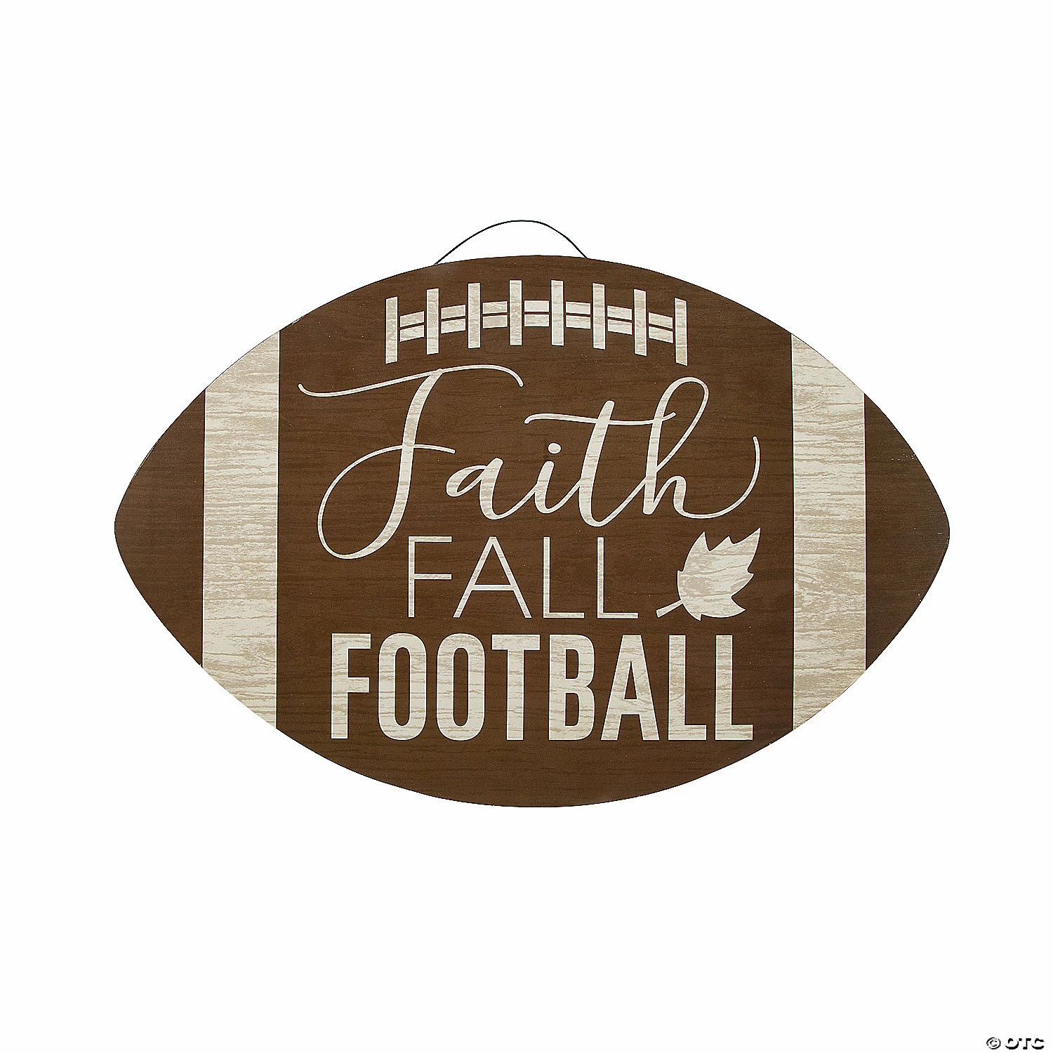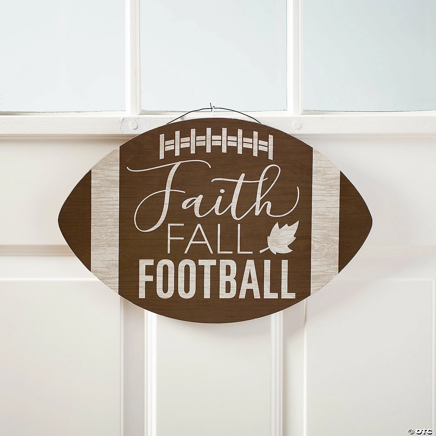 When autumn rolls around, spice up your home dΓ©cor with this rustic sign! A great addition to your front door, this hanging decoration lets visitors know that theyβre entering a place full of faith, fall and football. Wood. 16″ x 10 1/2″ Includes hardware for hanging. Β© OTC