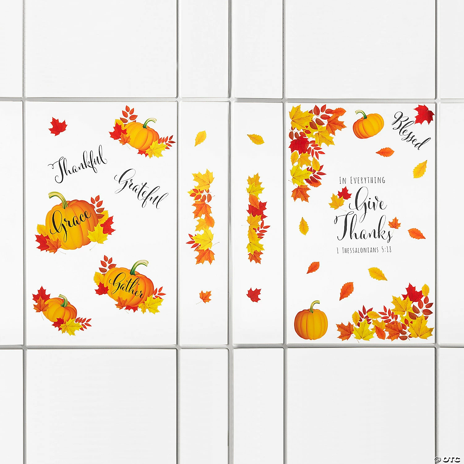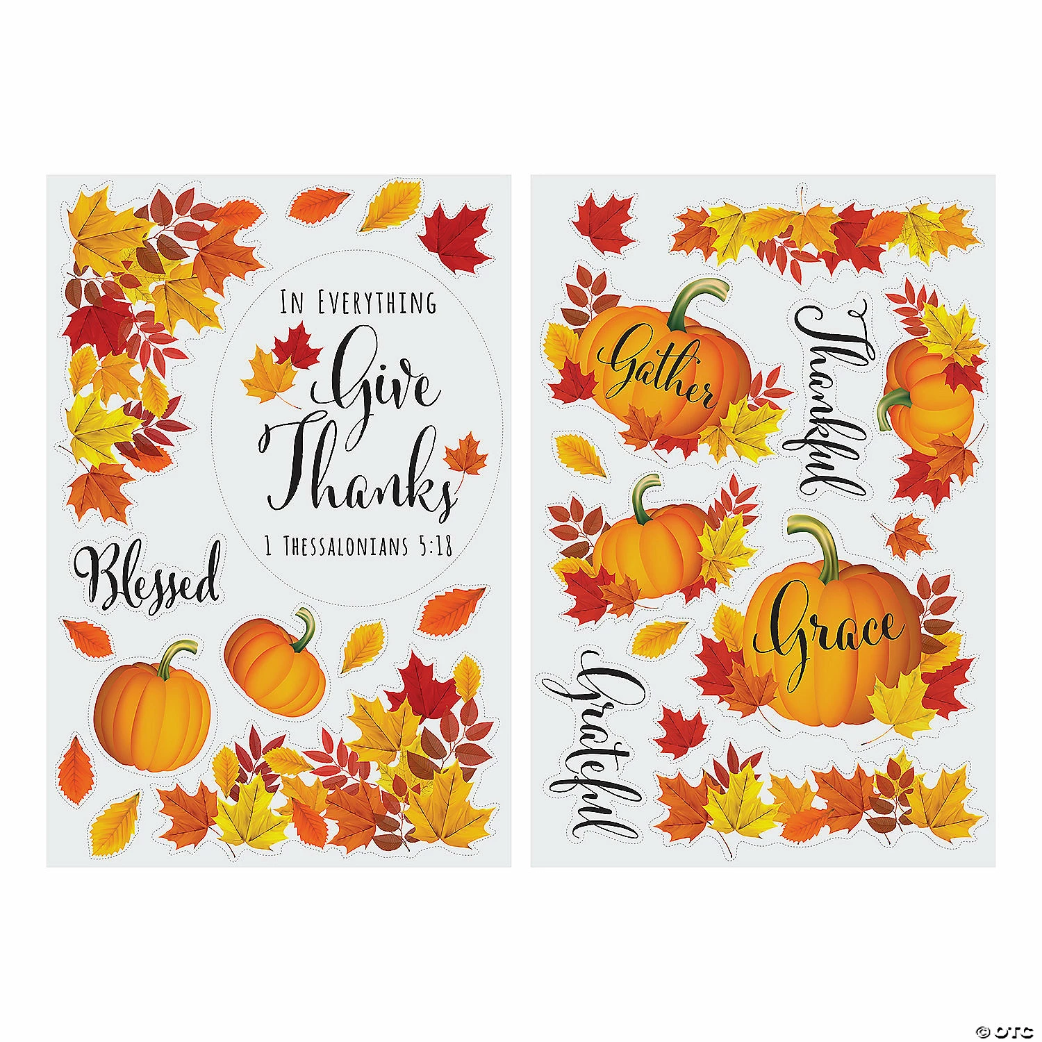 Celebrate and give thanks for Godβs grace and blessings with colorful religious window clings featuring fall foliage and words of gratitude. These autumn decorations will send a faith-affirming message when applied to church entrances and administrative office windows, religious classroom windows or in homes of the faithful. Vinyl. (27 pcs. per set) Sheets, 23 1/2″ x 35″ sheets. Β© OTC