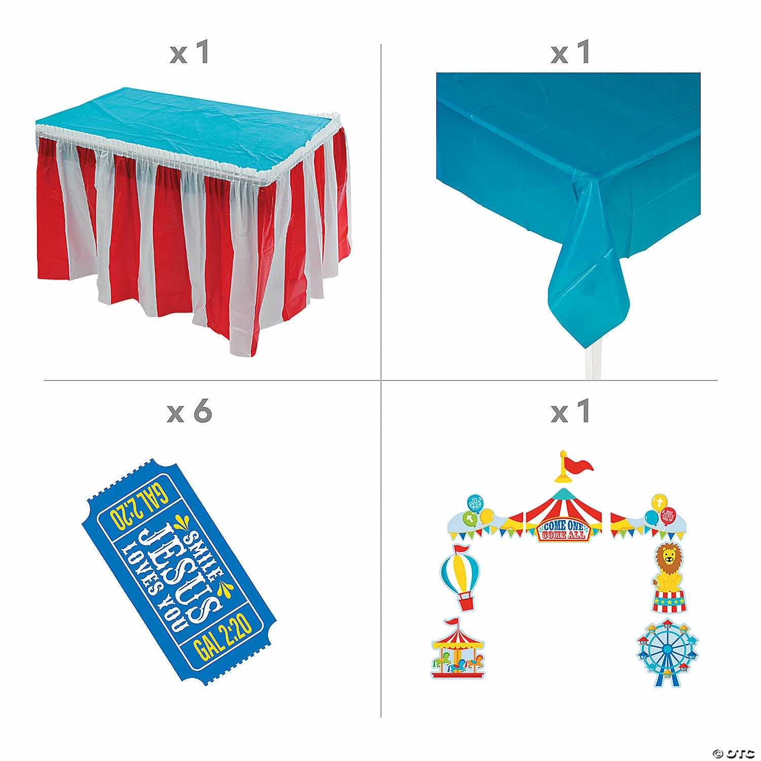 Come one, come all to a memorable fall carnival event! Dress up your car or truck with this all-inclusive kit chock full of fun, colorful carnival decorations sure to make guests marvel in delight. Whether at your home, school or church, this trunk-or-treat decorating kit has everything you need to host a memorable trunk-or-treat event. (15 pcs. per unit) Assortment may vary.Includes:β’ 7-Pc. Cardstock Faith Carnival Trunk-or-Treat Basic Decorating Kit (8 1/2″ – 18 1/4″ x 7 1/2″ – 17 1/2″ Simple assembly required.)β’ 1 Plastic Red & White Striped Table Skirt (14 ft. x 29″)β’ 6 Cardstock Religious Giant Carnival Ticket Cutouts (25″ x 12 3/4″)β’ 1 Plastic Turquoise Tablecloth (54″ x 108″ Thin, slightly transparent. Disposable.)