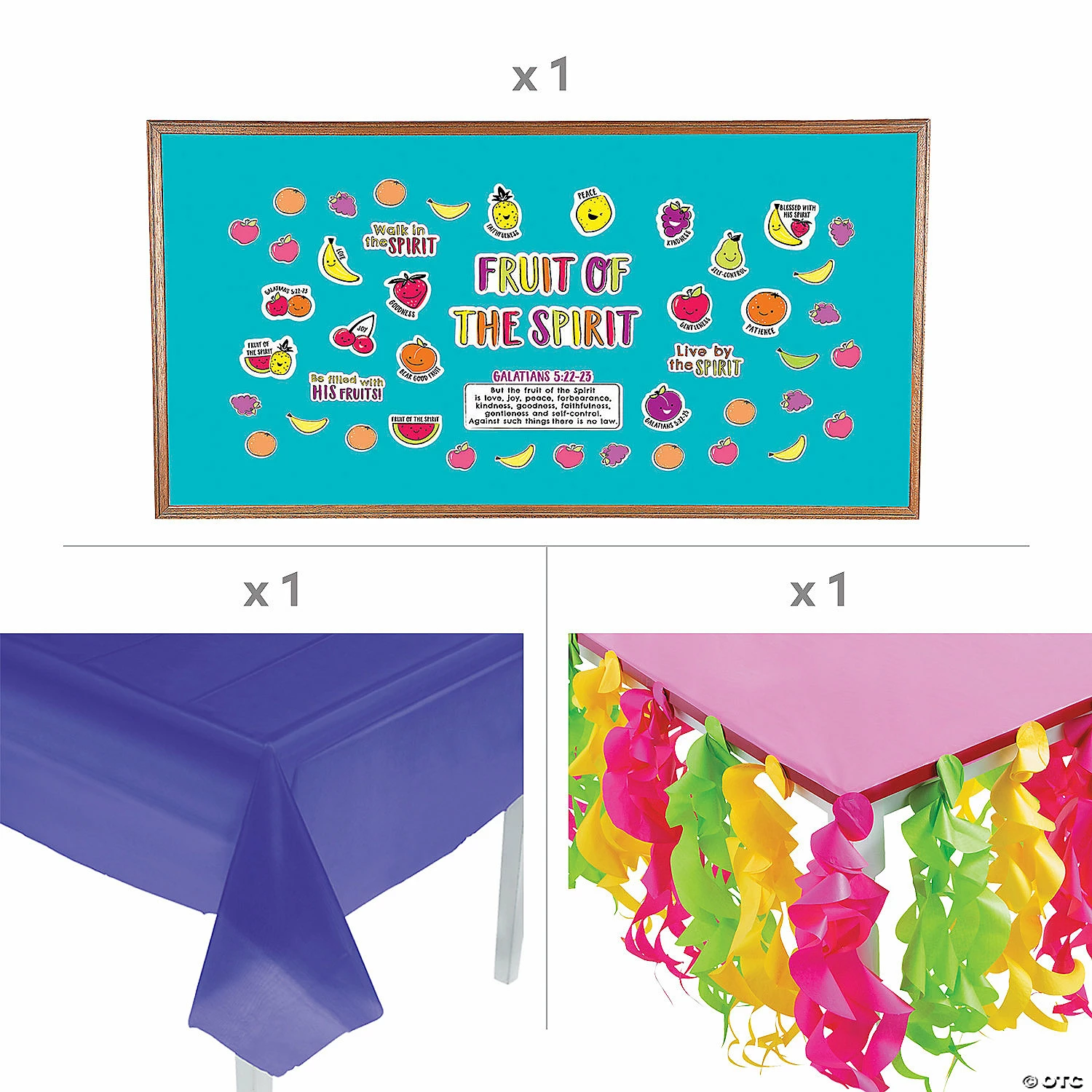 With so many goblins and spirits roaming around on Halloween, itβs better to recognize the most important spirit: the Holy Spirit! This colorful trunk-or-treat kit celebrates the Fruit of the Spirit and puts a faith-filled spin on a Halloween activity. A great choice for a church-sponsored trunk-or-treat event, this kit will also certainly stand out at any faith-filled trunk-or-treat event! (60 pcs. per unit) Assortment may vary.Includes:β’ 53-Pc. Cardstock Fruit of the Spirit Bulletin Board Set (Includes 30 blank cutouts. 3 1/2″ – 19 1/2″ x 4 1/2″ – 9 1/2″)β’ 1 Plastic Purple Tablecloth (54″ x 108″ Thin, slightly transparent. Disposable.)β’ 1 Tissue Paper Luau Swirl Table Skirt (9 ft. x 26″)β’ 4 Tissue Paper Tutti Frutti Fruit Honeycomb Hanging Decorations (10″ Simple assembly required.)β’ 1 Tissue Paper Large Pineapple Honeycomb Decoration (11 3/4″ x 25″ Simple assembly required.)