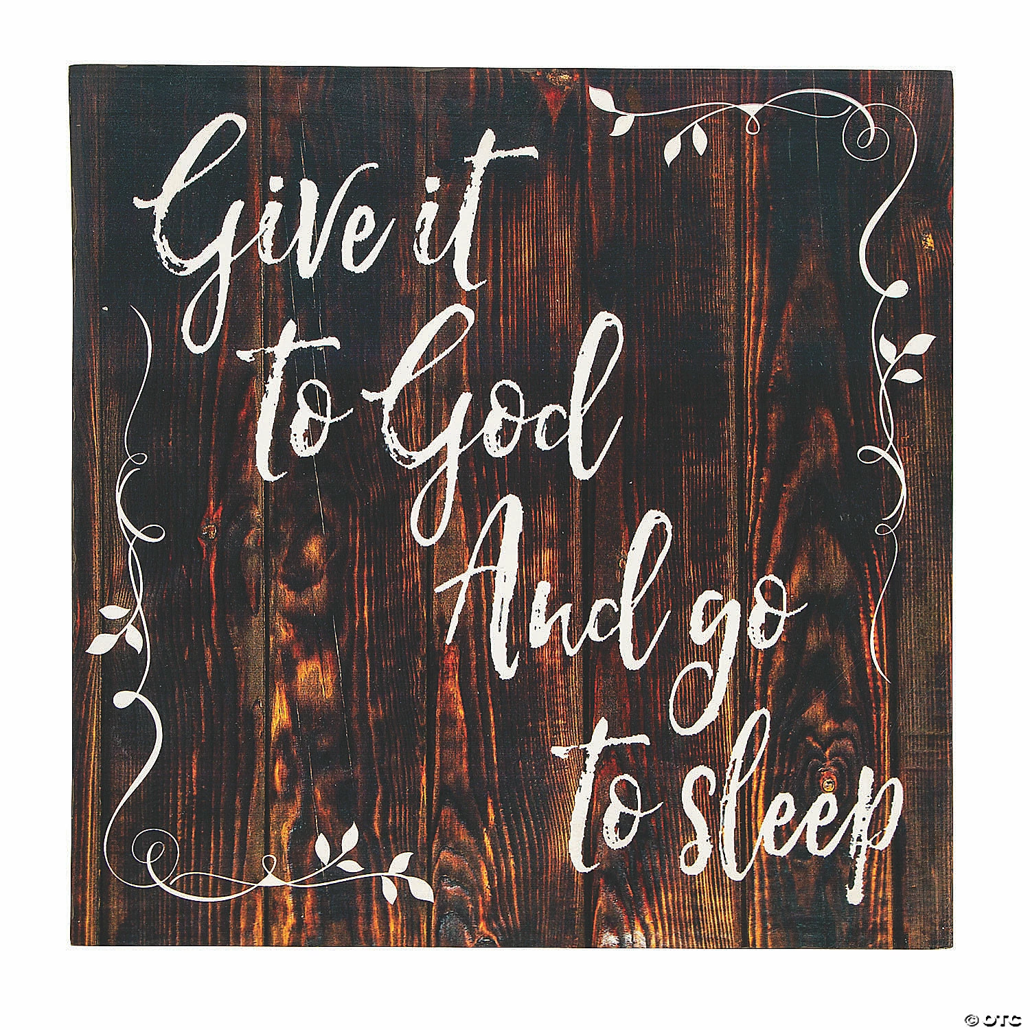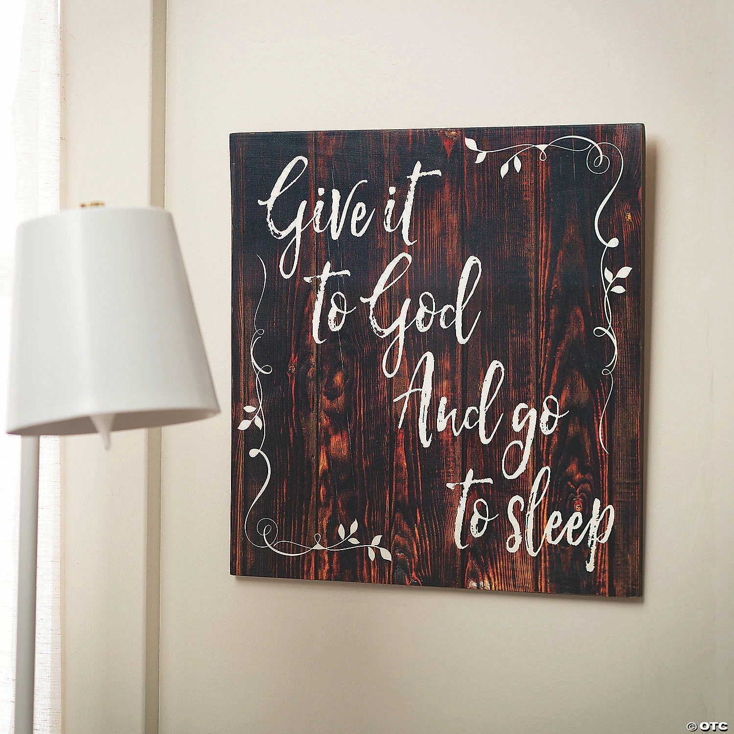 A simple reminder not to take your worries to bed with you, this home dΓ©cor religious sign, which reads, βGive it to God and go to sleep,β would be right at home in the bedroom of a child, teen, adult or senior. The gentle spiritual guidance in this quote makes it a beautiful inspirational gift for a caregiver, grandparent or clergy member to give or receive. Wood. 12″ x 12″ Includes hardware for hanging.