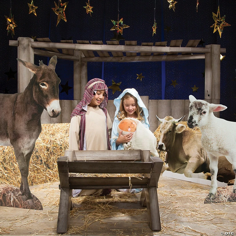 Get everything you need to set the scene for a church Nativity play! With these stable essentials and animal stand-ups, you can recreate the Bethlehem stable where Jesus was born. Just add in costumed kids as Mary and Joseph, the shepherds and the angels, and the three Wise Men, and bring these Nativity decorations to life! Cardboard. (7 pcs. per set) Stand-ups are one-sided with a brown cardboard back. Assembly required. © OTCIncludes: • Donkey Nativity Stand-Up, 33 1/2″ x 49 1/2″• Lamb Nativity Stand-Up, 28 1/2″ x 38″• Cow Nativity Stand-Up, 61″ x 28 1/2″• 3D Manger Stand-Up, 25 1/4″ x 27″ x 20 1/4″• 3D Stable Stand-Up, 114″ x 44″ x 66″• Two Flat Hay Bale Stand-Ups, 51″ x 24 1/4″