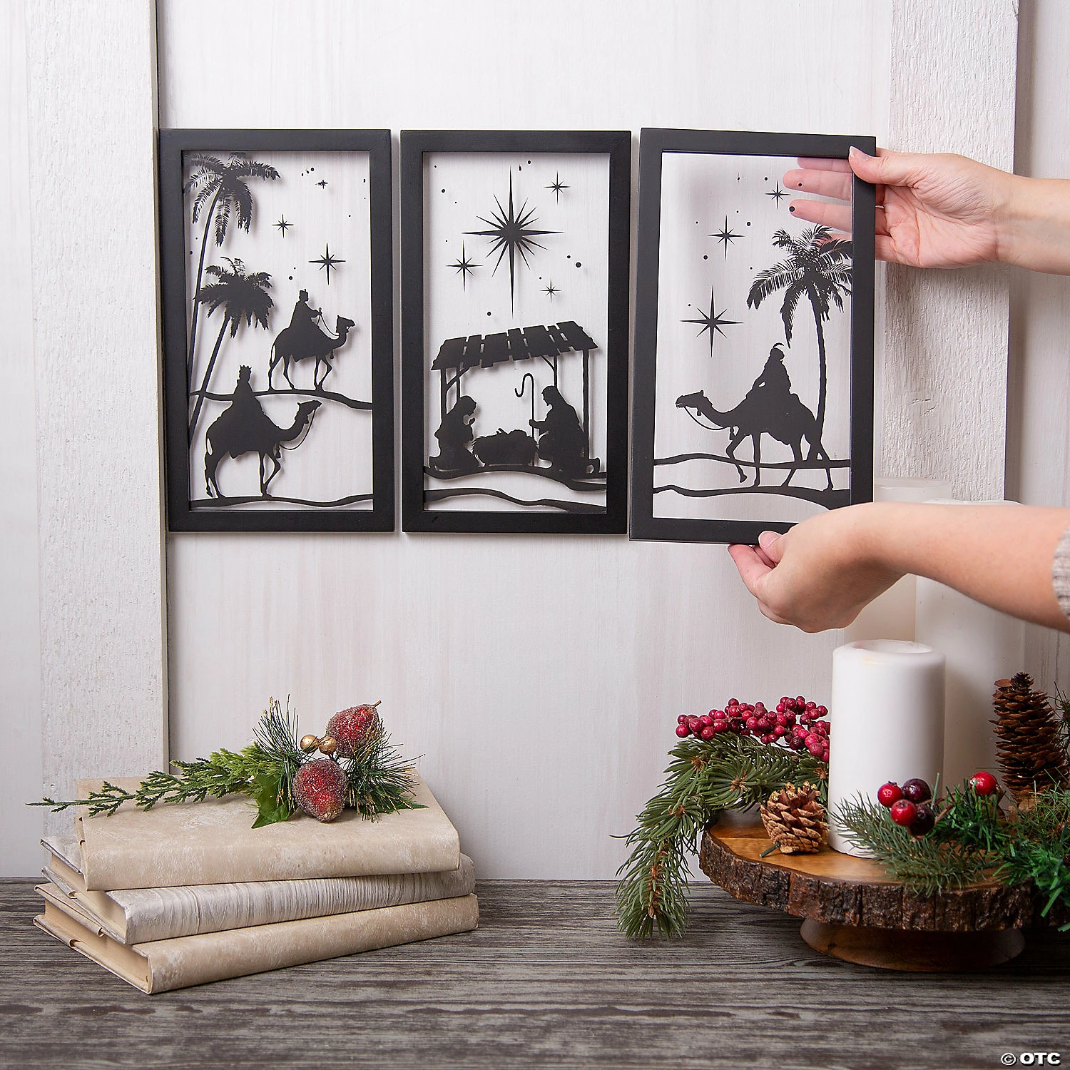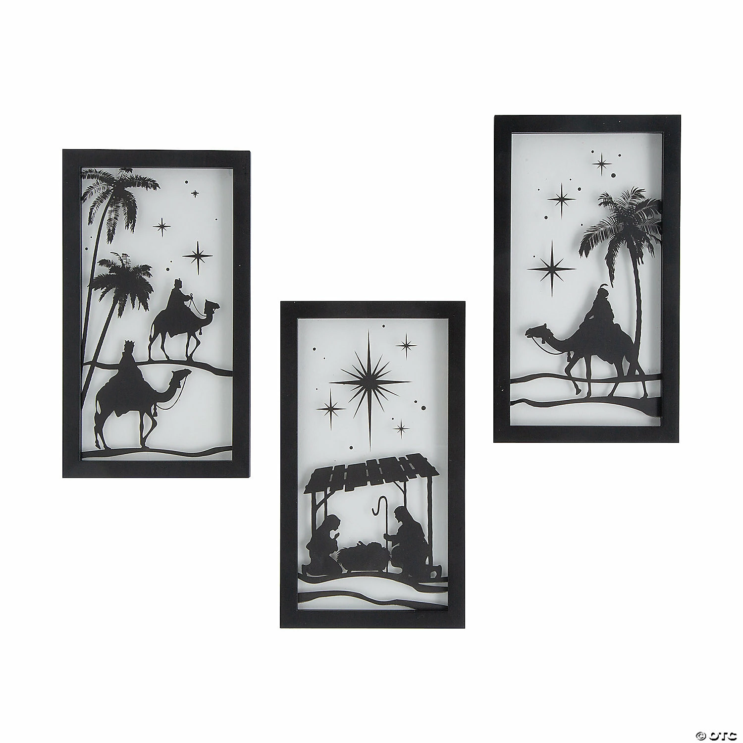 This lovely sign set is a fantastic piece of faith home decor for the Christmas season. Each frame holds a silhouette image of the Nativity scene on clear acrylic for a look that will go nicely with just about any holiday decor. A thoughtful gift and a charming addition to home holiday decor, these signs look great displayed together. Wood with acrylic. (3 pcs. per set) 6 1/2″ x 11 1/2″ Includes hardware for hanging. Β© OTC