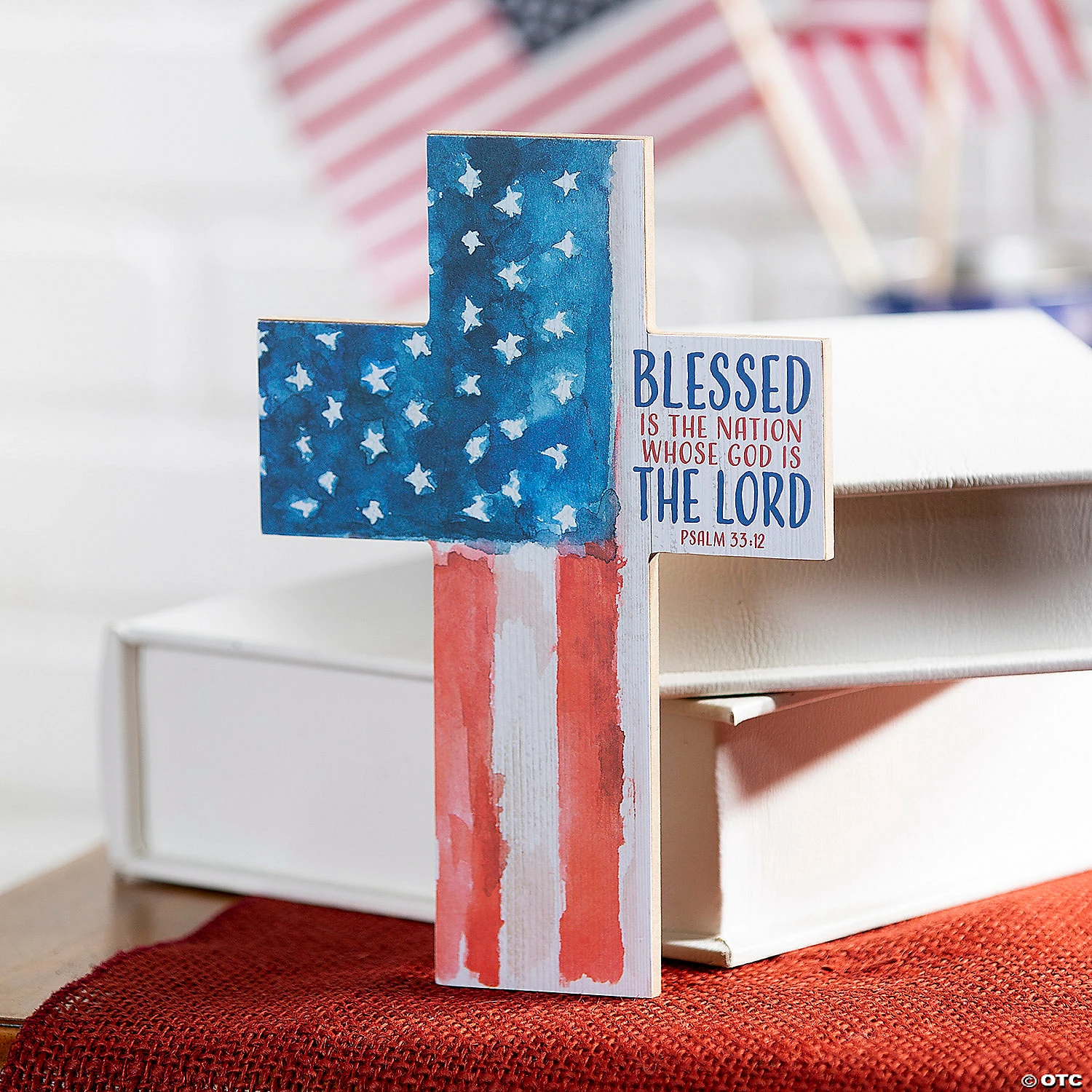 Add this wall sign to your patriotic home decorations. The muted colors and wood grain make this cross a perfect complement to your other rustic decor. Bold lettering on the Bible quote from Psalm 33 is a striking contrast to the muted red, white and blue coloring. Includes hardware for hanging. Wood. 6″ x 8 1/2″ Β© OTC