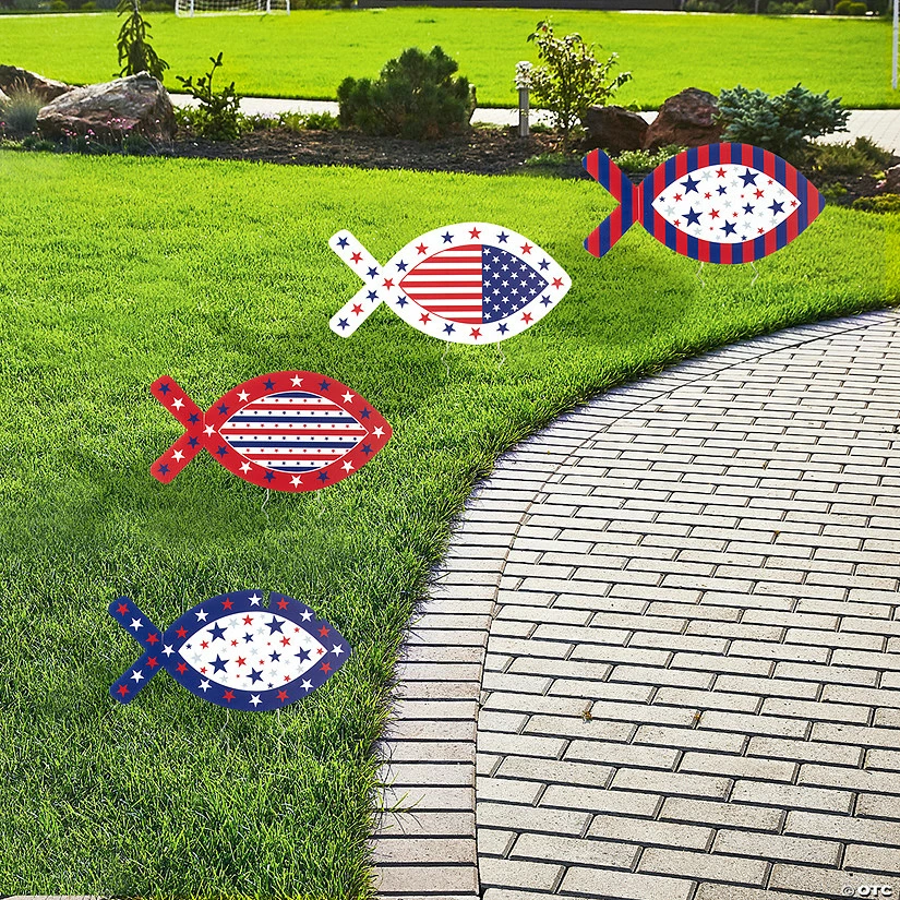 Show off your faith and your patriotism with these eye-catching yard stakes. Featuring patriotic colors and Ichthys shapes, these yard stakes make a bold statement about pride in the USA and pride in Christian beliefs. Add these red, white and blue fish-shaped yard stakes to outdoor decorations for the Fourth of July. Corrugated plastic. (4 pcs. per unit) 19″ x 9-3/4″ Includes metal stakes. Single-sided. Simple assembly required. Β© OTC
