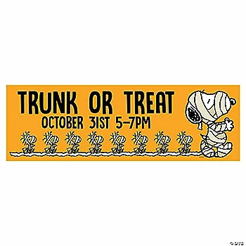 A super versatile Halloween decoration that allows you to celebrate Halloween with the Peanuts® crew! Perfect for any Halloween celebration, especially a trunk-or-treat event. this custom banner features Snoopy and Woodstock wrapped like mummies wandering away. Personalize with 2 lines of text. Vinyl. 72″ x 23″ Includes adhesive tabs for hanging. © OTC