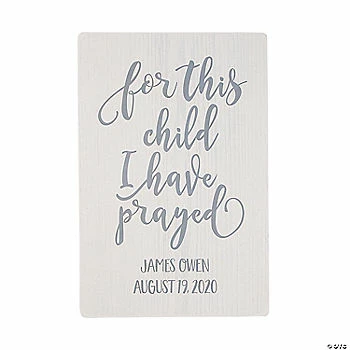 Pre-printed with “for this child I have prayed.” Add the name and date of the child’s birth and it will make a lovely addition to home dΓ©cor or as a decoration in the baby’s room. Personalize with 2 lines of text. 12″ x 18″ Includes hardware for hanging. Β© OTC