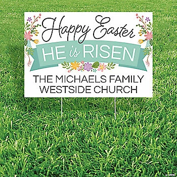 Spread some faith-filled Easter greetings into the community with this personalized yard sign. Featuring a lovely floral design alongside the messages βHappy Easterβ and βHe is risenβ, this eye-catching yard sign also has personalized text. This outdoor Easter decoration is perfect outside an Easter service and also looks good outside a home. Corrugated plastic. 24″ x 16″ Personalize with 2 lines of text. Includes metal stakes. Single-sided. Simple assembly required. © OTC