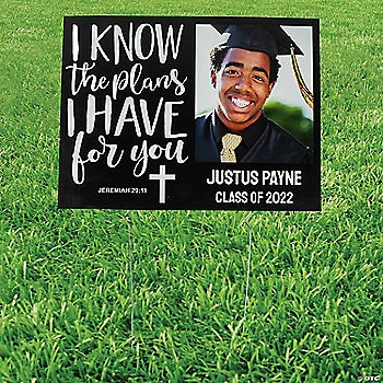 Celebrate the graduate with this eye-catching and faith-filled yard sign. Featuring Jeremiah 29:11 along with an uploaded photo and personalized text, this yard sign is a special way to celebrate the gradβs accomplishments! Great as an outdoor decoration for a graduation party or as a graduation announcement to the community, this sign puts the spotlight on the grad and on God! Single-sided. Includes metal stakes. Corrugated plastic. 24″ x 18″ Personalize with 2 lines of text and 1 uploaded photo. Simple assembly required. © OTC
