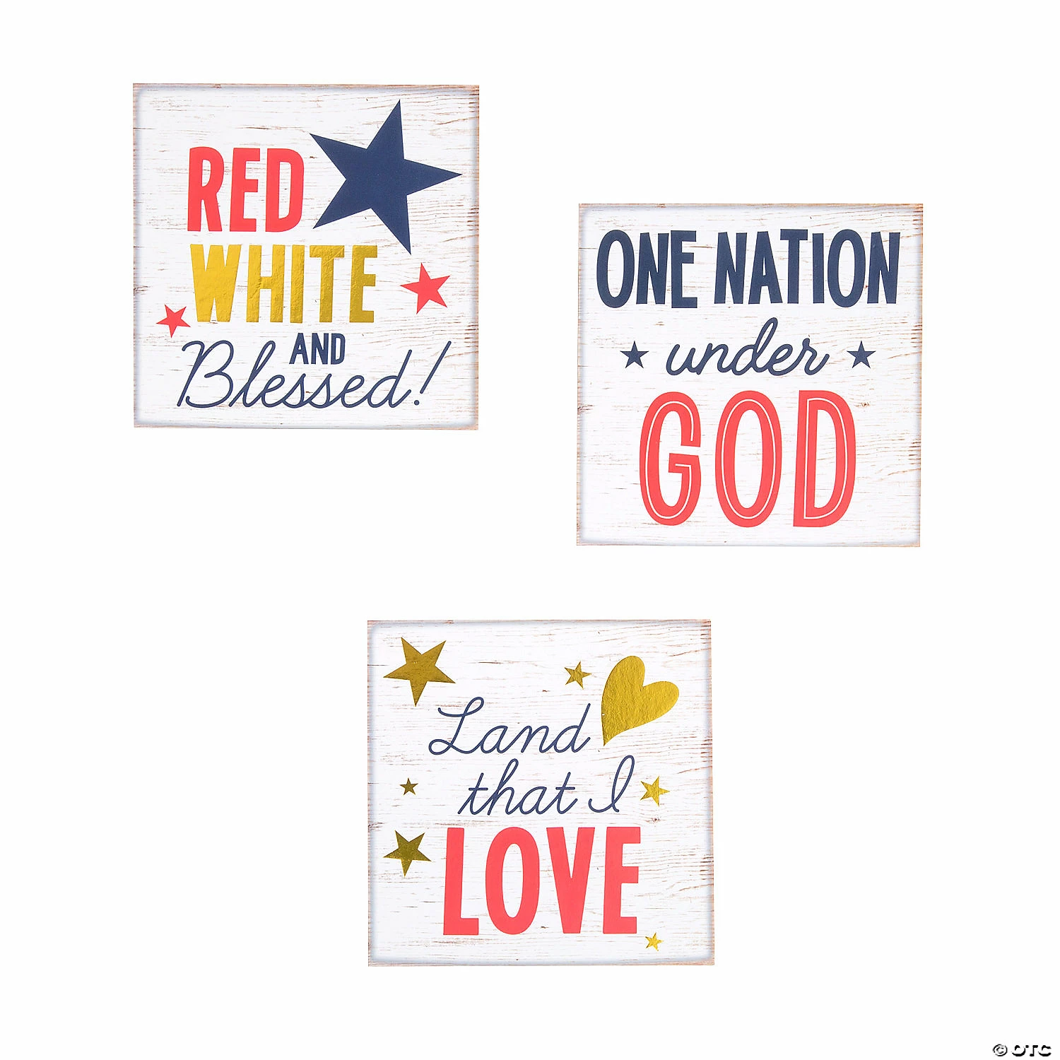 Are you feeling red, white and blessed? Then you need this cute set of patriotic blocks! Featuring a vintage whitewash design with faith-inspired sayings like βOne Nation under Godβ, these signs are perfect for Fourth of July home dΓ©cor. Arrange them on your mantel, side table or anywhere throughout your home. Wood. (3 pcs. per set) 6″ x 6″ Β© OTC