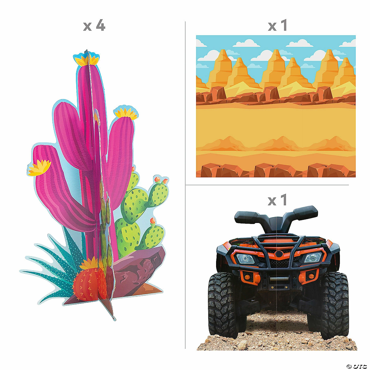 Add the feel of the Southwest to any space with this desert scene decorating kit thatβs perfect for Southwest VBS. Great as a photo booth opportunity or as Southwest VBS decorations, this scene can also be set up within the VBS space as a quiet prayer area or as a decoration for the registration/check in table. (6 pcs. per unit) Assortment may vary. Simple assembly required.Includes:β’ 1 Plastic Dig Design-A-Room Background (Assembled, 30 ft. x 8 ft.)β’ 4 cardboard Southwest VBS Colorful Cacti Stand-Ups (24″ – 25″ x 32″ – 40″)β’ 1 Cardboard Dig VBS All Terrain Vehicle Stand-Up (45 1/2″ x 42″)