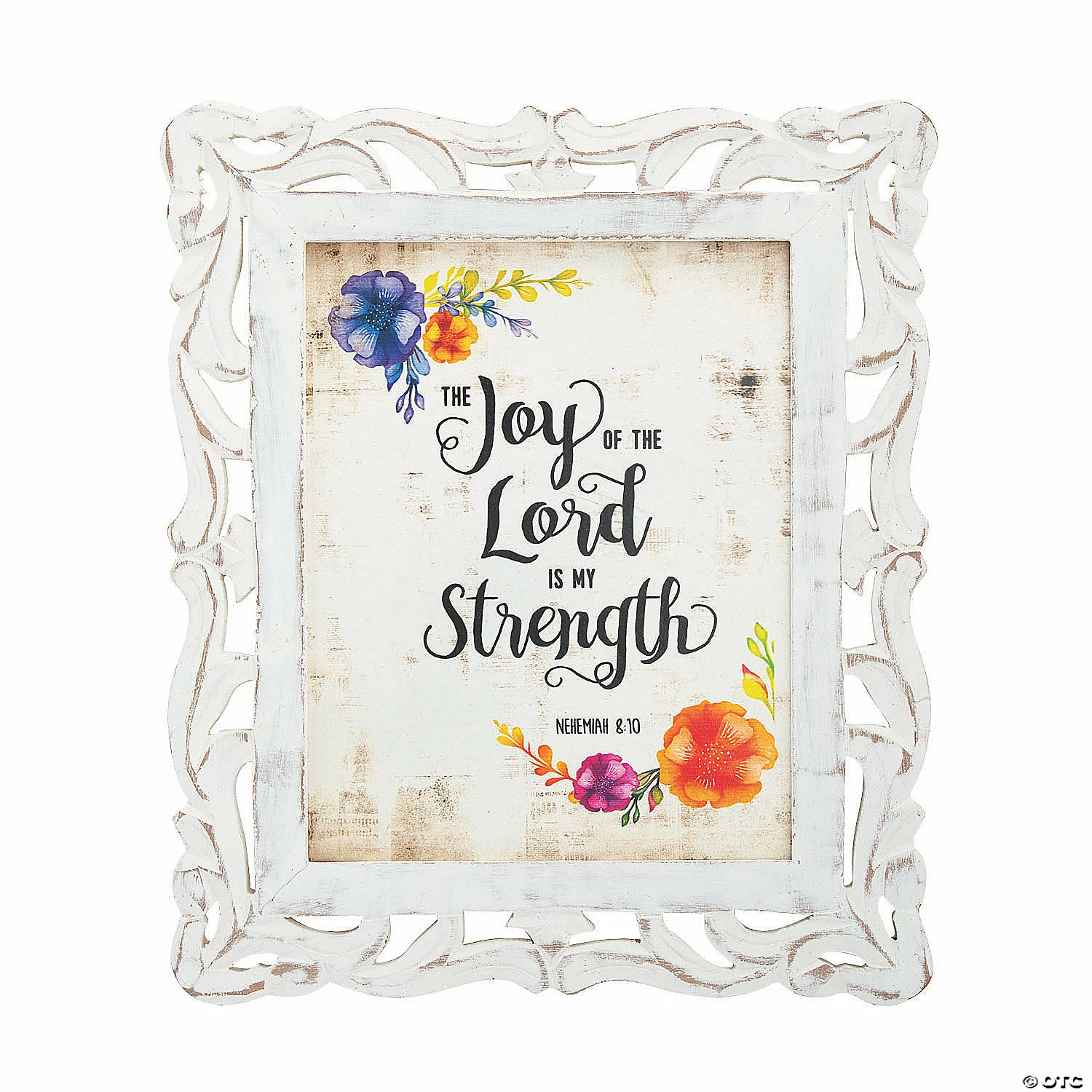 A faith-affirmation a day keeps the blues away. This one, from Nehemiah 8:10, βThe Joy of the Lord is my Strengthβ is a religious wall hanging decoration on a rustic white background, bordered with colorful flowers in an ornate, weathered frame, that makes an inspiring, faith-based housewarming gift or home dΓ©cor keepsake. Wood. 11 1/2″ x 13 1/2″ Includes hardware for hanging.