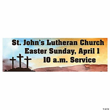 Share big church news with this medium Personalized Crosses Banner. With three crosses, this banner is perfect for letting church members know about Holy Week and Easter services. Personalize with 3 lines of up to 26 characters/spaces on lines 1 and 2 and up to 20 characters/spaces on line 3. Vinyl. 72″ x 23″ © OTC